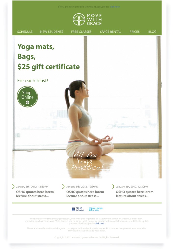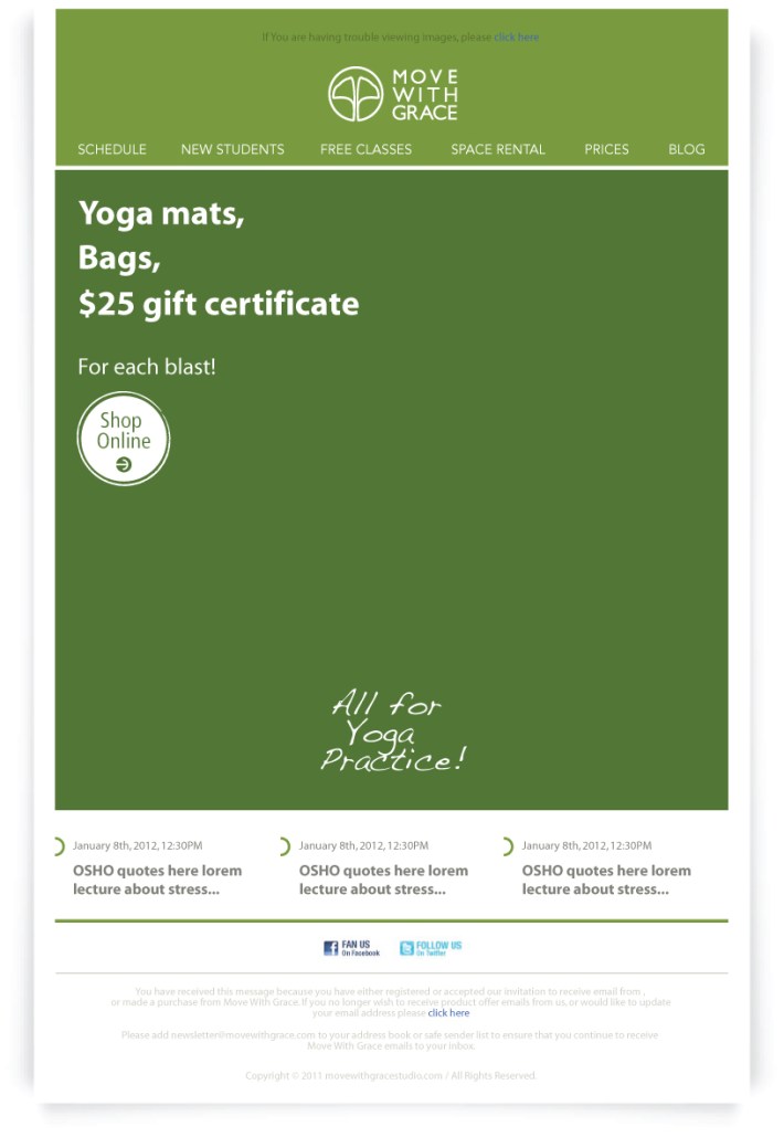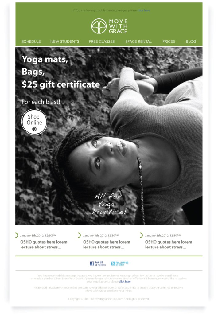 Grace form Move With Grace yoga studio has so many things to do, that i needed to come-up with a newsletter template, which never changes its’ look (composition), but it is easy to change color of background & fonts, change background itself & insert textual info within minutes.