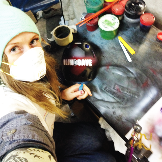 BLINDSAVE logo on the back of the mask.. turning it int Red & grey instead of usual blue & pink.